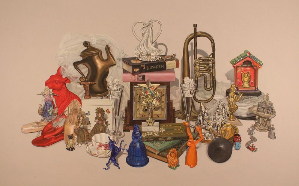 This original painting was commissioned by Carrie Secrist (owner of Carrie Secrist Gallery in Chicago) and her husband Bill Beach. Carrie selected from her life-long collection of personally significant objects and arranged this still life. The overall composition is intended to signify her wedding day; each object and the relationships between them symbolize all of the life events and people that brought her there.